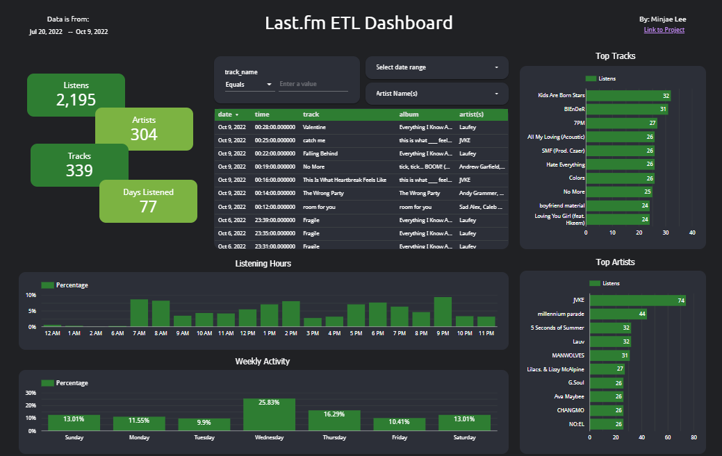The project is an ETL pipeline which processes music listening data from Last.fm API to provide insight on listening activity. The data is transformed and orchestrated into Kimball's star schema model using Python, SQL, and Airflow. The data is then loaded into Google Data Studio for visualization.
